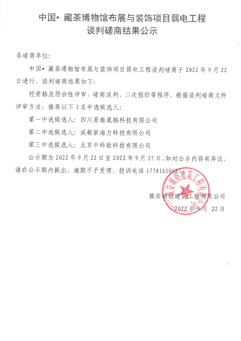 中國• 藏茶博物館布展與裝飾項目弱電工程談判磋商結果公示