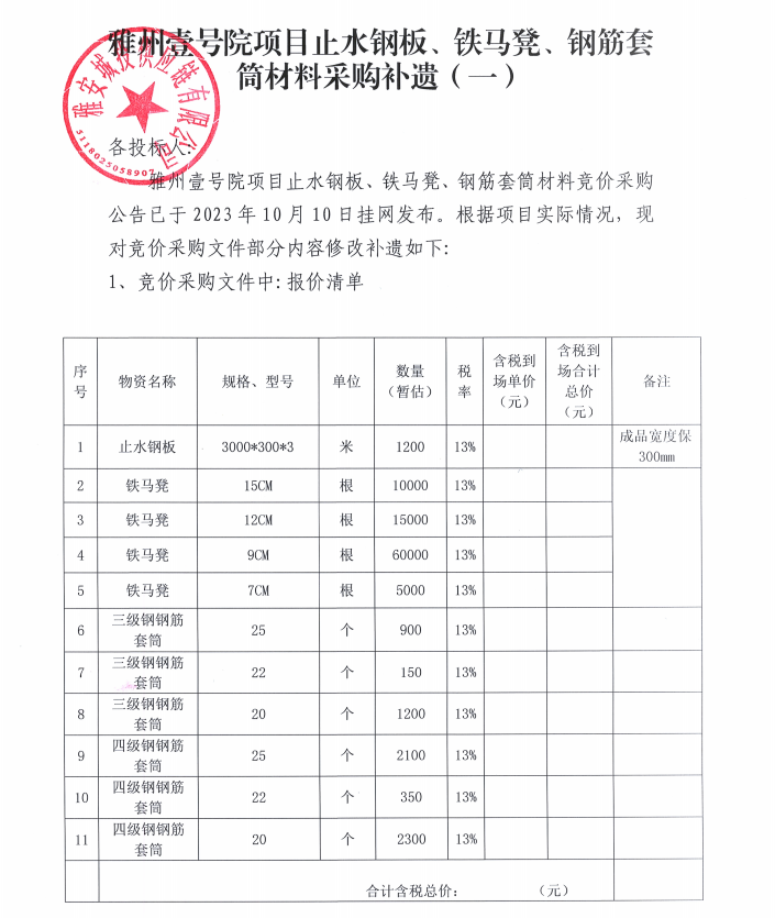 雅州壹號(hào)院項(xiàng)目止水鋼板、鐵馬凳、鋼筋套筒材料采購補(bǔ)遺(一)