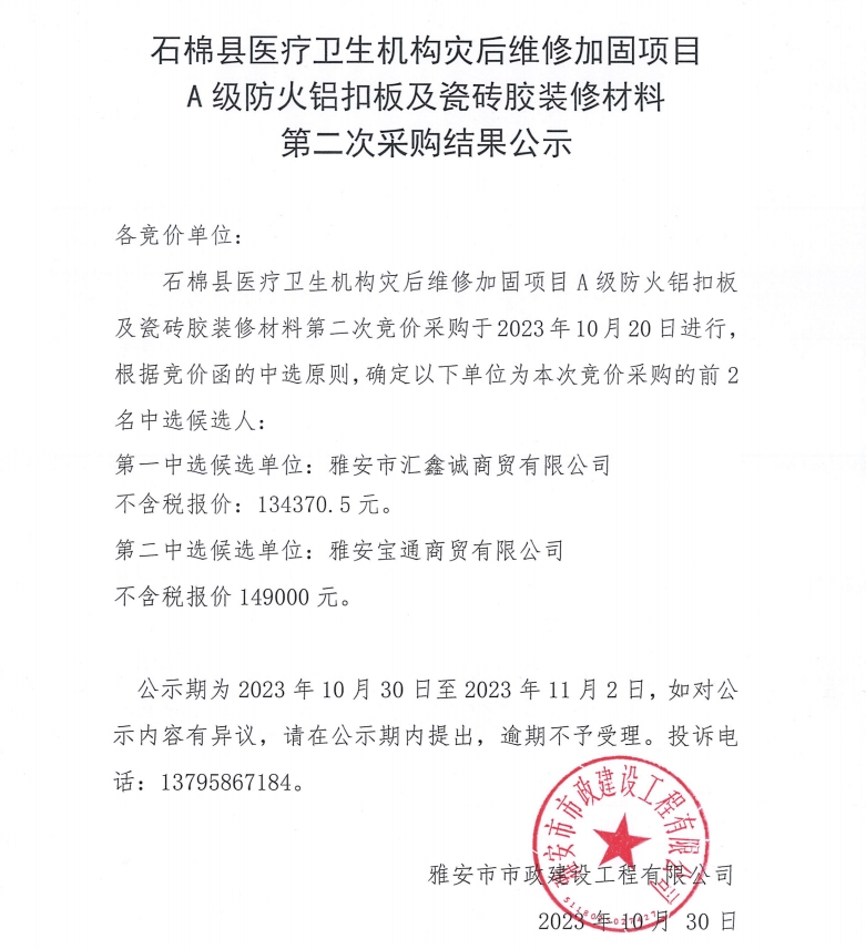 石棉縣醫(yī)療衛(wèi)生機構災后維修加固項目A級防火鋁扣板及瓷磚膠裝修材料第二次采購結(jié)果公示