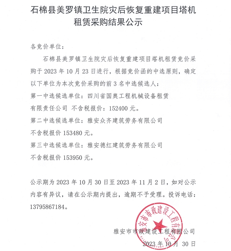 石棉縣美羅鎮(zhèn)衛(wèi)生院災(zāi)后恢復(fù)重建項(xiàng)目塔機(jī)租賃采購結(jié)果公示