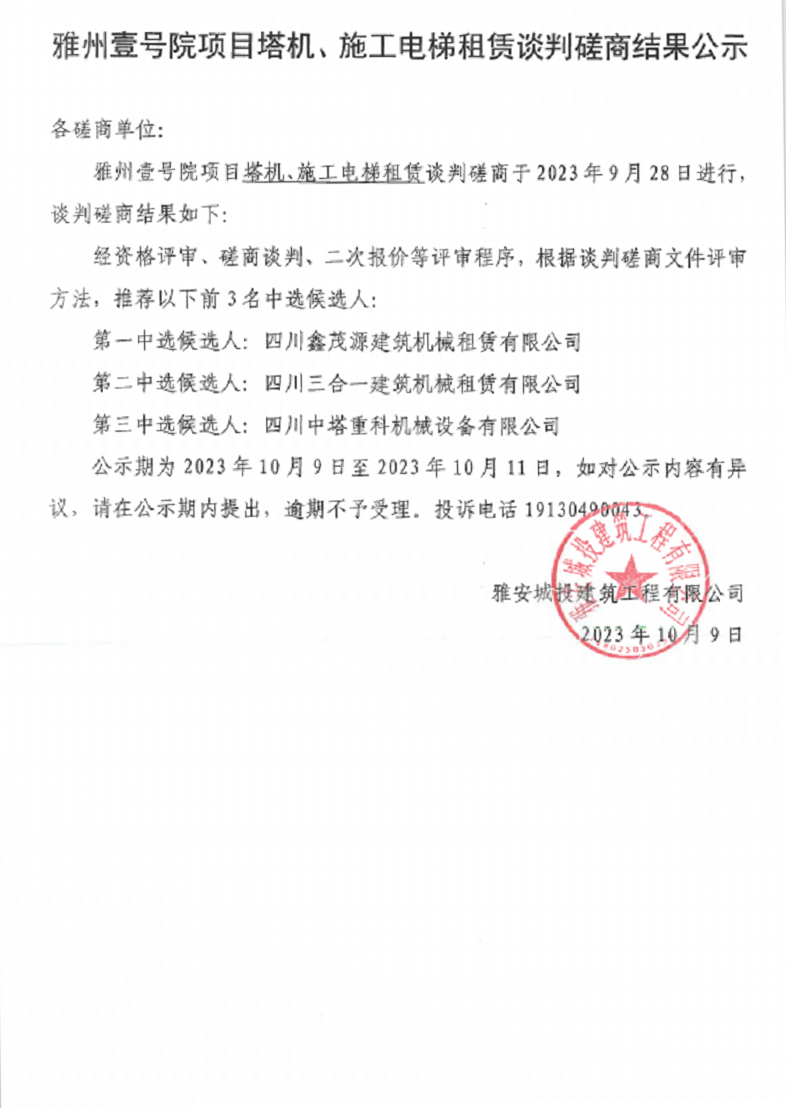 雅州壹號院項目塔機、施工電梯租賃談判磋商結(jié)果公示