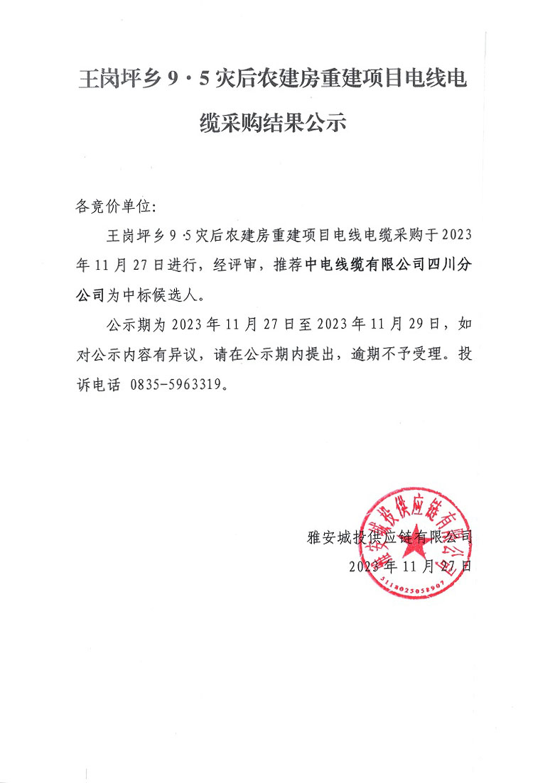 王崗坪鄉(xiāng)9·5災(zāi)后農(nóng)建房重建項目電線電纜采購結(jié)果公示