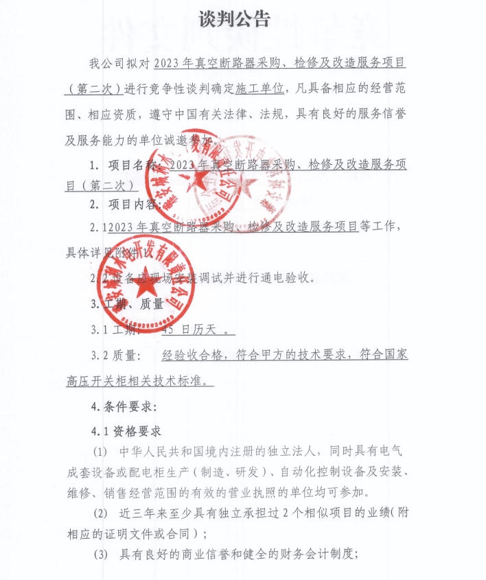 2023年真空斷路器采購(gòu)、檢修及改造服務(wù)項(xiàng)目(第二次)談判公告