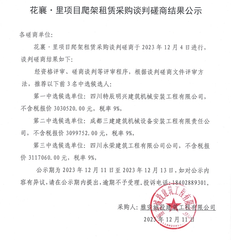 花襄·里項(xiàng)目爬架租賃采購(gòu)談判磋商結(jié)果公示