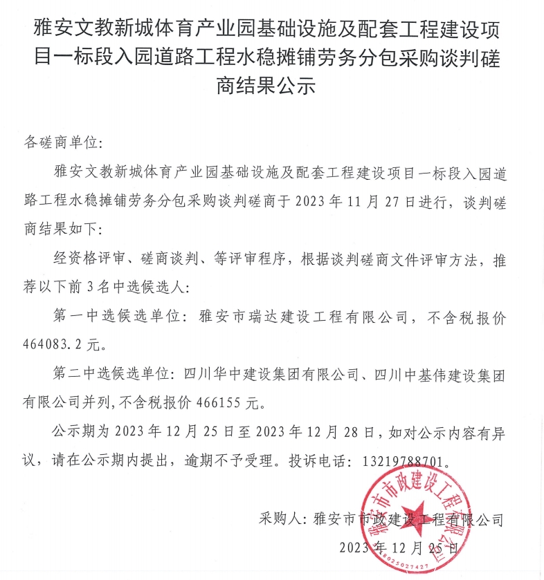 雅安文教新城體育產(chǎn)業(yè)園基礎設施及配套工程建設項目一標段入園道路工程水穩(wěn)攤鋪勞務采購談判磋商結果公示