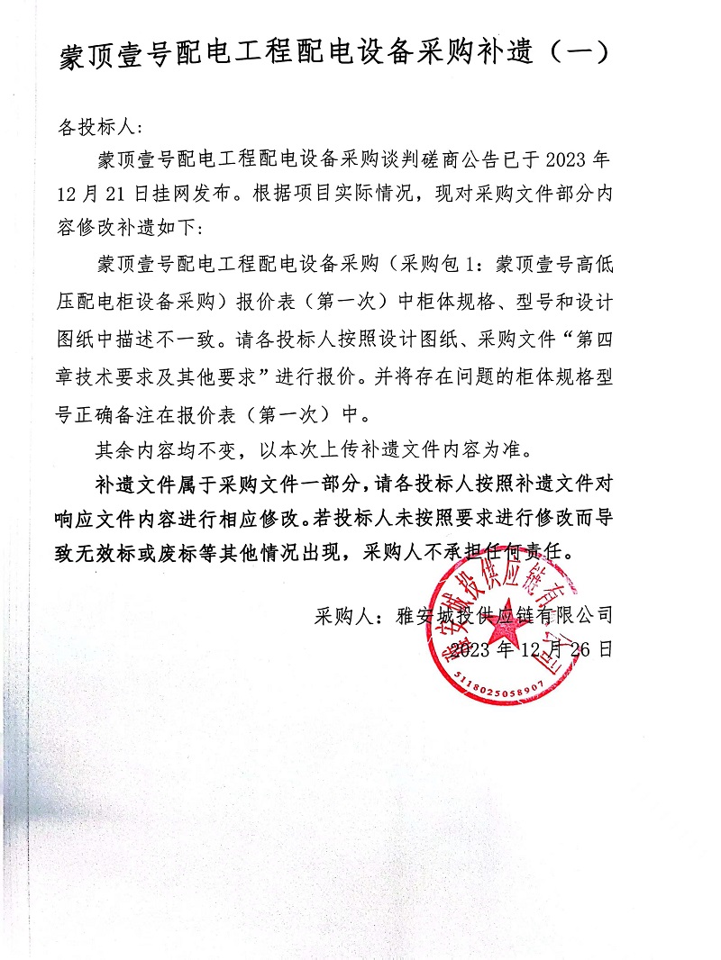 蒙頂壹號配電工程配電設備采購補遺(一)