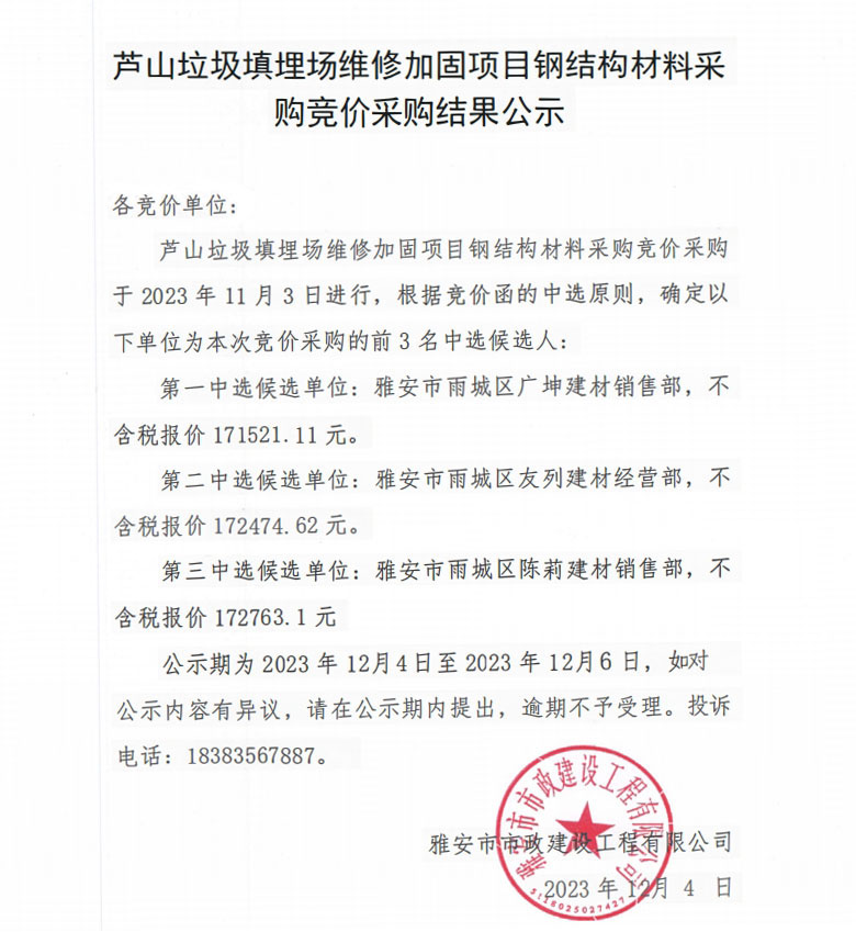 蘆山垃圾填埋場維修加固項目鋼結(jié)構(gòu)材料采購競價采購結(jié)果公示