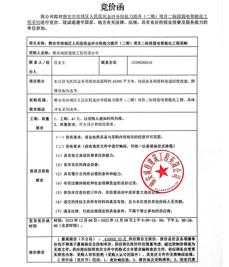 雅安市雨城區(qū)人民醫(yī)院金沙分院能力提升(二期)項目二標(biāo)段弱電智能化工程采購競價公告