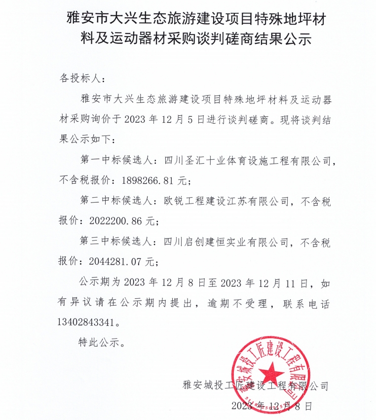 雅安市大興生態(tài)旅游建設項目特殊地坪材料及運動器材采購談判磋商結果公示
