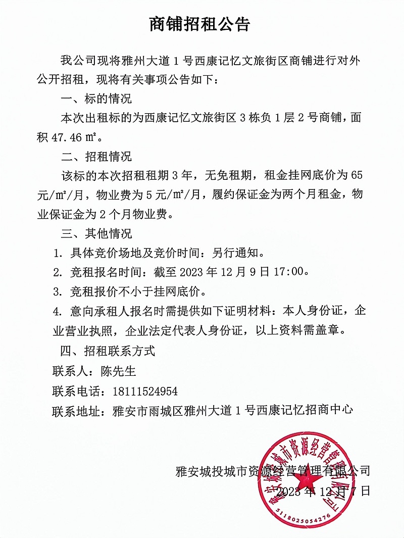 雅州大道1號西康記憶文旅街區(qū)3棟負(fù)1層2號商鋪招租公告