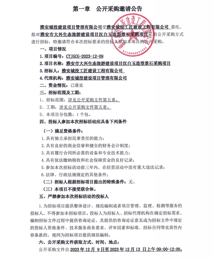 雅安市大興生態(tài)旅游建設(shè)項(xiàng)目漢白玉造型景石采購項(xiàng)目公開采購邀請公告