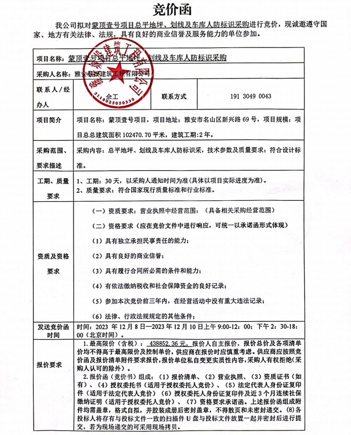 蒙頂壹號項目總平地坪、劃線及車庫人防標(biāo)識采購競價公告