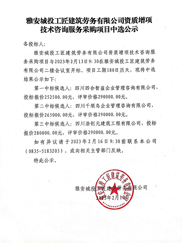 雅安城投工匠建筑勞務(wù)有限公司資質(zhì)增項(xiàng)技術(shù)咨詢服務(wù)采購項(xiàng)目中選公示