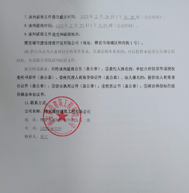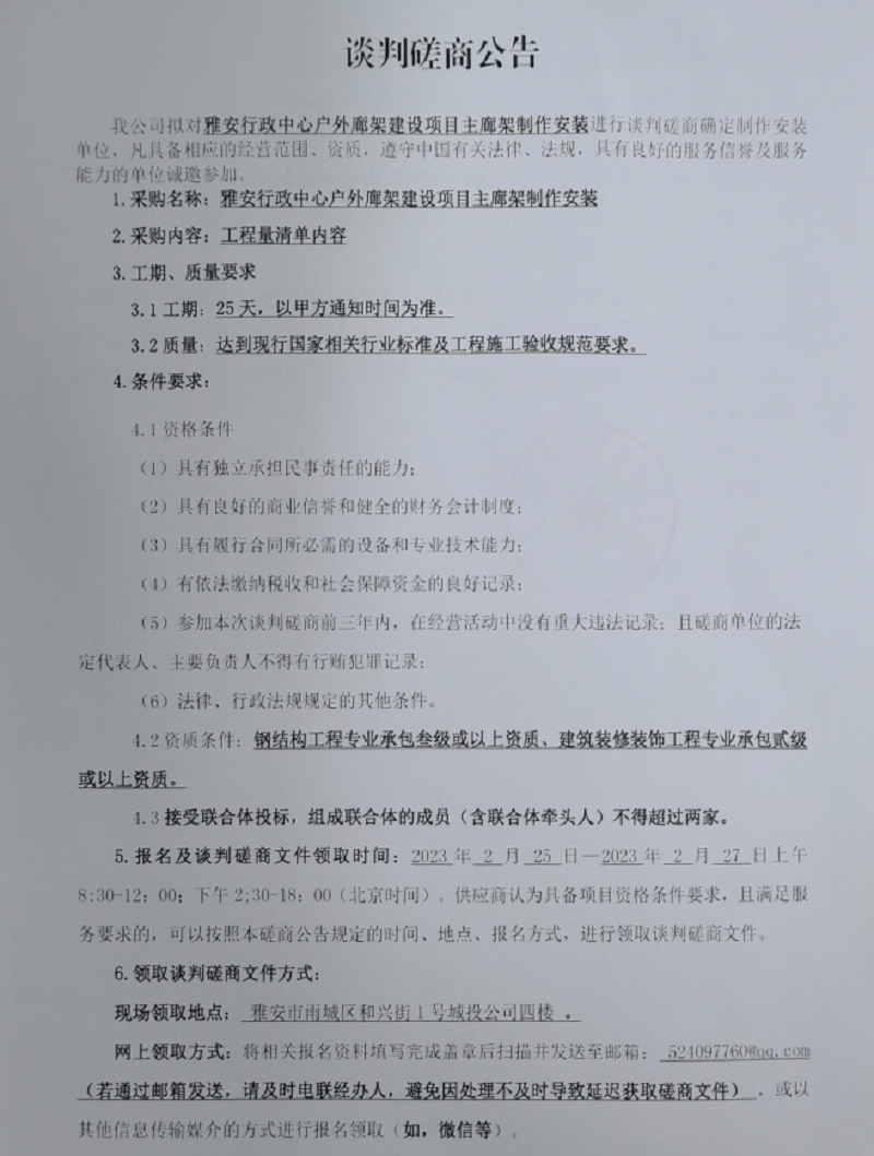 雅安行政中心戶外廊架建設(shè)項目主廊架制作安裝談判磋商公告
