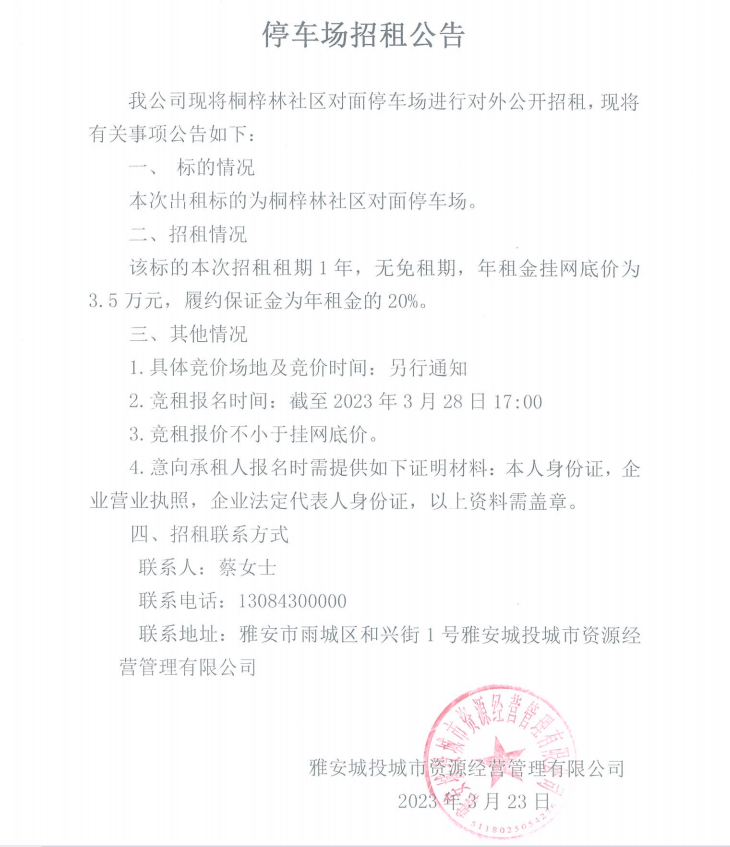 桐梓林社區(qū)對(duì)面停車場(chǎng)招租公告