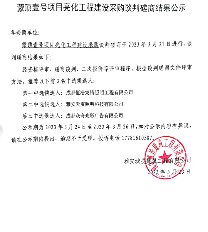 蒙頂壹號項目亮化工程建設(shè)采購談判磋商結(jié)果公示