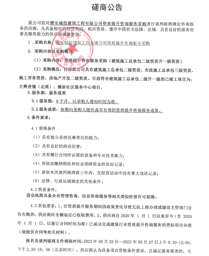 雅安城投建筑工程有限公司資質(zhì)提升咨詢(xún)服務(wù)采購(gòu)磋商公告