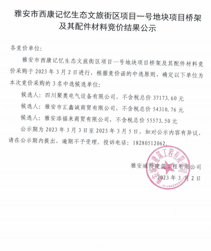 雅安市西康記憶生態(tài)文旅街區(qū)項目一號地塊項目橋架及其配件材料競價結果公示