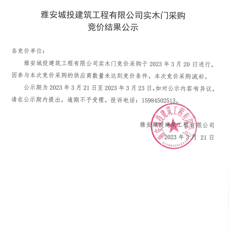 雅安城投建筑工程有限公司實(shí)木門采購競價結(jié)果公示