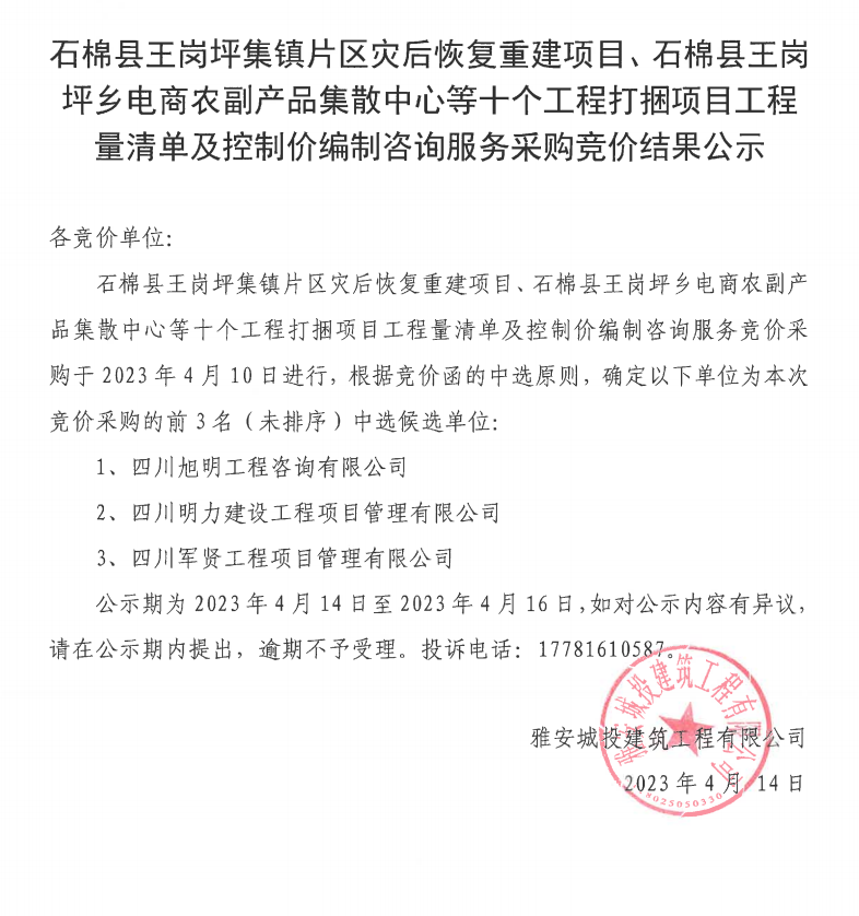 石棉縣王崗坪集鎮(zhèn)片區(qū)災后恢復重建項目、石棉縣王崗坪鄉(xiāng)電商農副產品集散中心等十個工程打捆項目工程量清單及控制價編制咨詢服務采購競價結果公示