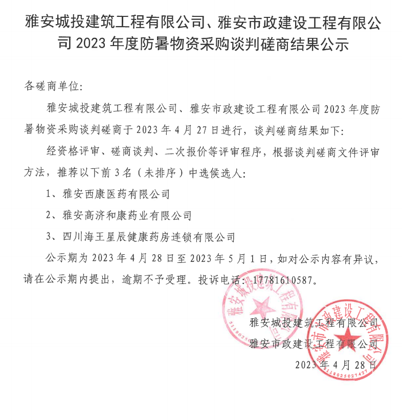 雅安城投建筑工程有限公司、雅安市政建設工程有限公司2023年度防暑物資采購談判磋商結果公示