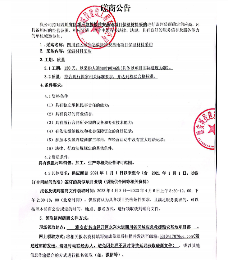 四川省區(qū)域應急救援雅安基地項目保溫材料采購談判磋商公告