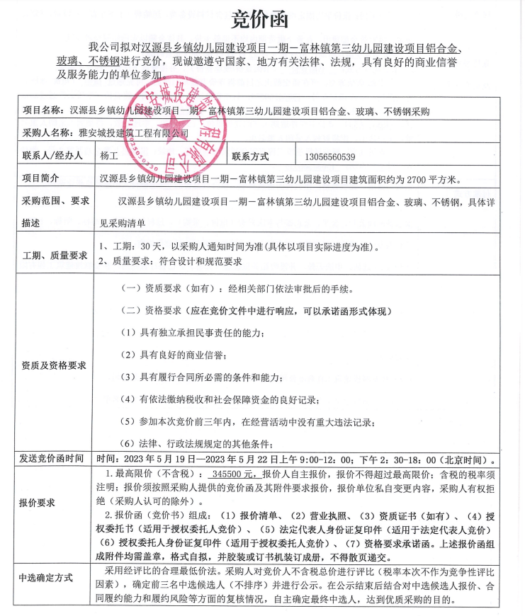 漢源縣鄉(xiāng)鎮(zhèn)幼兒園建設(shè)項目一期一富林鎮(zhèn)第三幼兒園建設(shè)項目鋁合金、玻璃、不銹鋼采購競價公告