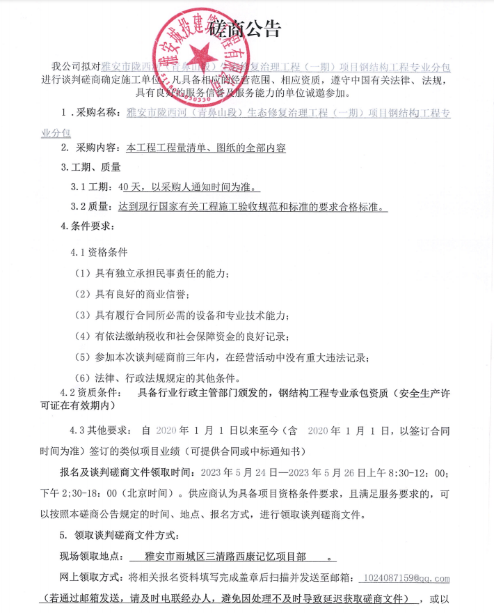 雅安市隴西河(青鼻山段)生態(tài)修復治理工程(一期)項目鋼結構工程專業(yè)分包談判磋商公告