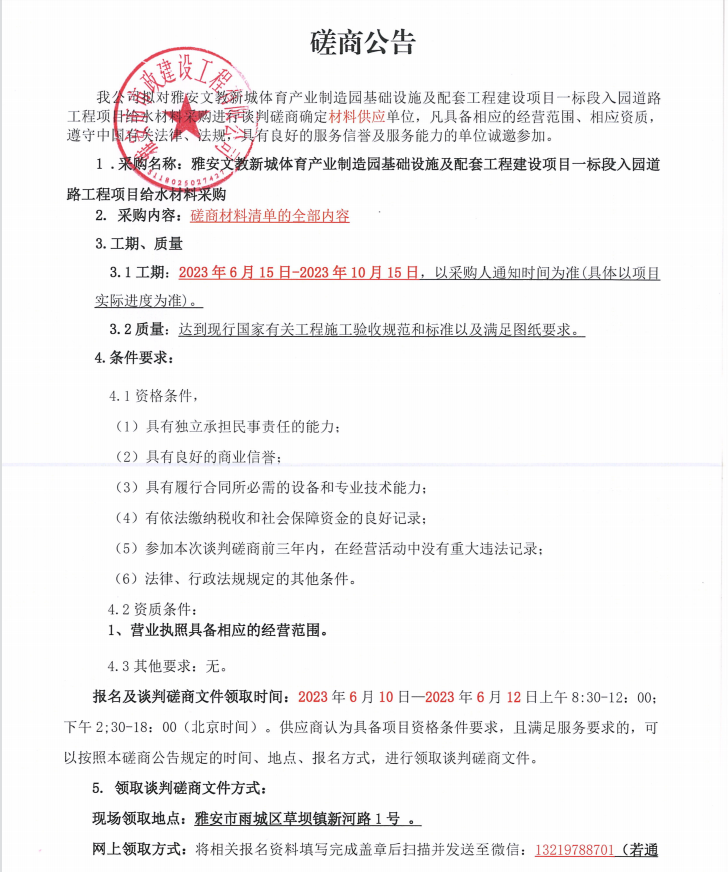 雅安文教新城體育產(chǎn)業(yè)制造園基礎(chǔ)設(shè)施及配套工程建設(shè)項(xiàng)目一標(biāo)段入園道路工程項(xiàng)目給水材料采購(gòu)談判磋商公告