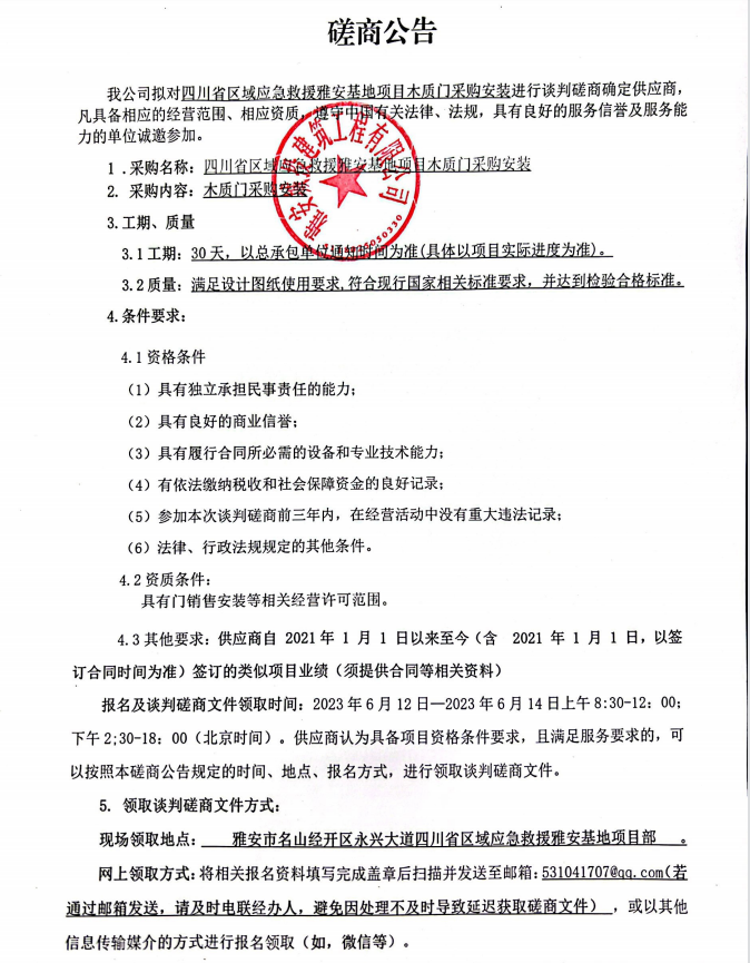 四川省區(qū)域應(yīng)急救援雅安基地項(xiàng)目木質(zhì)門采購(gòu)安裝談判磋商公告
