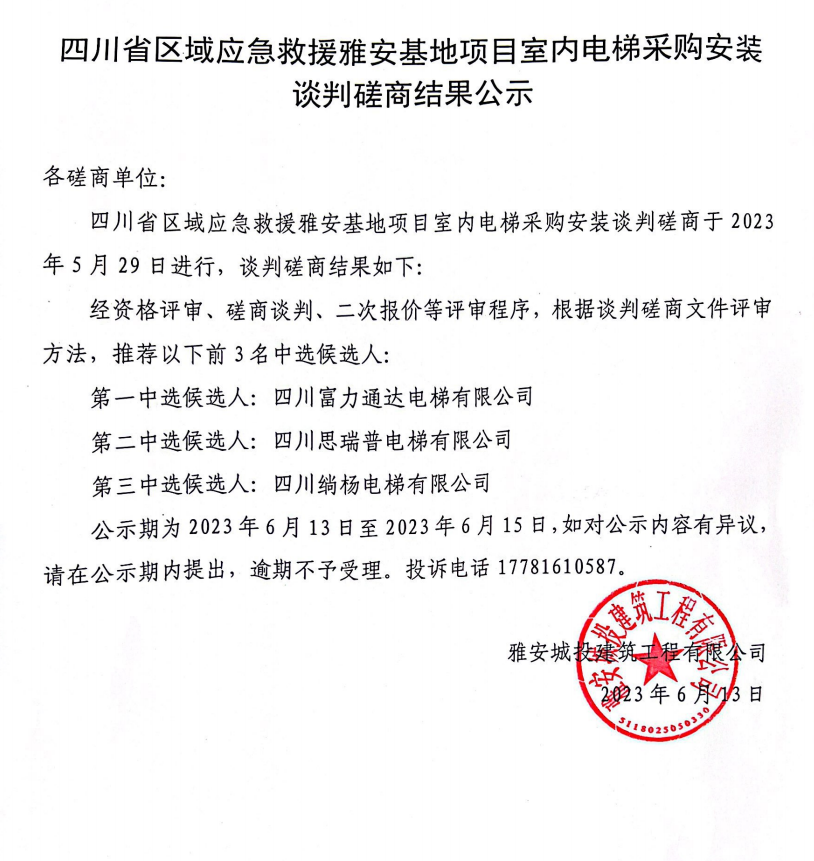 四川省區(qū)域應(yīng)急救援雅安基地項(xiàng)目室內(nèi)電梯采購(gòu)安裝談判磋商結(jié)果公示
