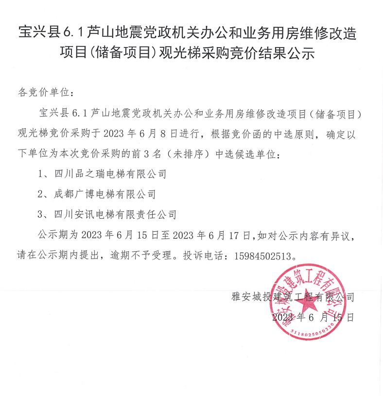 寶興縣6.1蘆山地震黨政機(jī)關(guān)辦公和業(yè)務(wù)用房維修改造項(xiàng)目(儲(chǔ)備項(xiàng)目)觀光梯采購競價(jià)結(jié)果公示