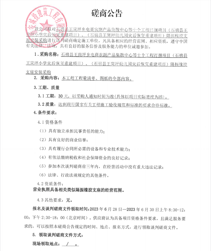 石棉縣王崗坪鄉(xiāng)電商農(nóng)副產(chǎn)品集散中心等十個(gè)工程打捆項(xiàng)目(石棉縣王崗坪小學(xué)災(zāi)后恢復(fù)重建項(xiàng)目)、(石棉縣王崗坪幼兒園災(zāi)后恢復(fù)重建項(xiàng)目)隔振橡膠支座安裝采購(gòu)談判磋商公告