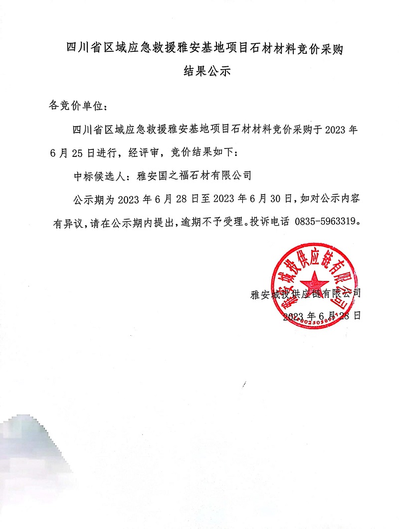 四川省區(qū)域應(yīng)急救援雅安基地項(xiàng)目石材材料競價采購結(jié)果公示