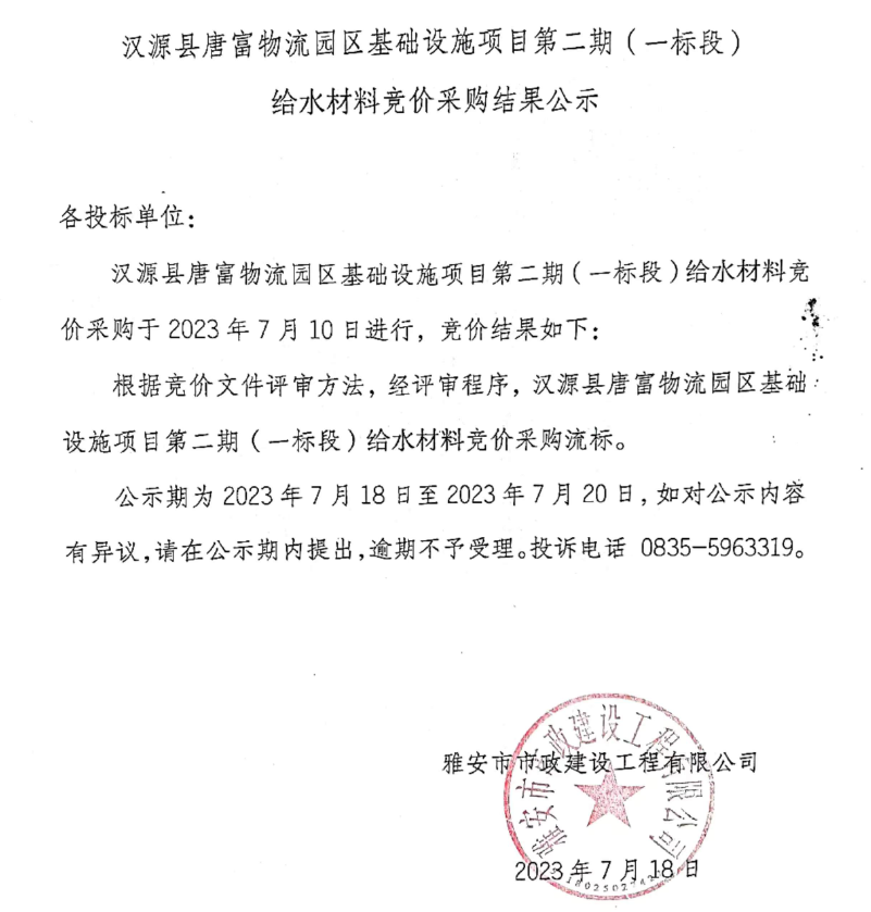 漢源縣唐富物流園區(qū)基礎(chǔ)設(shè)施項(xiàng)目二期(一標(biāo)段)給水材料競價采購結(jié)果公示