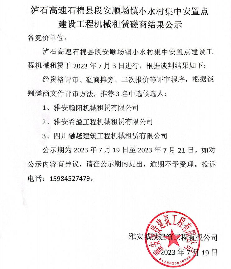 瀘石高速石棉縣段安順場鎮(zhèn)小水村集中安置點建設(shè)工程機(jī)械租賃談判磋商結(jié)果公示