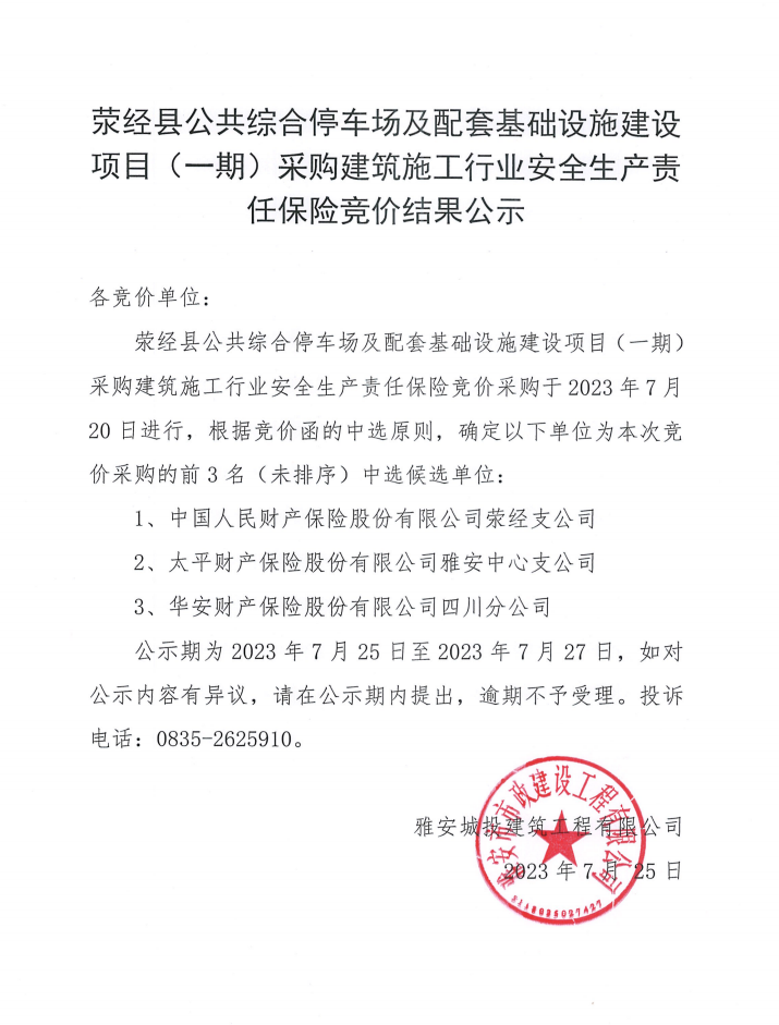 滎經(jīng)縣公共綜合停車場及配套基礎(chǔ)設(shè)施建設(shè)項目(一期)采購建筑施工行業(yè)安全生產(chǎn)責(zé)任保險競價結(jié)果公示