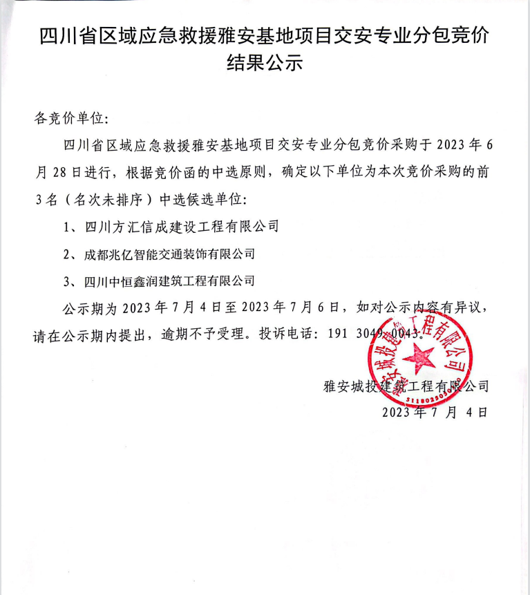 四川省區(qū)域應(yīng)急救援雅安基地項(xiàng)目交安專業(yè)分包競(jìng)價(jià)結(jié)果公示