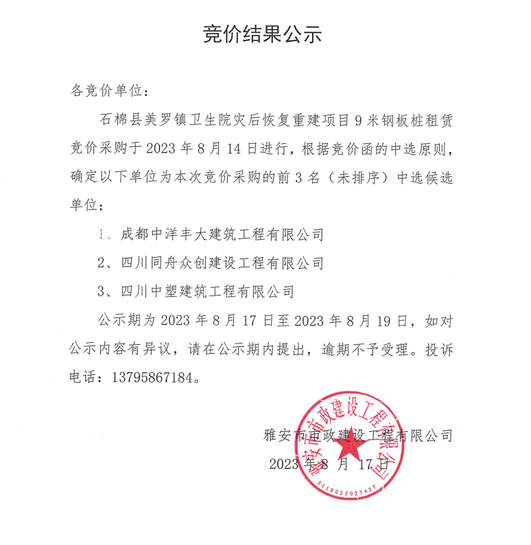 石棉縣美羅鎮(zhèn)衛(wèi)生院災后恢復重建項目9米鋼板樁租賃競價結(jié)果公示
