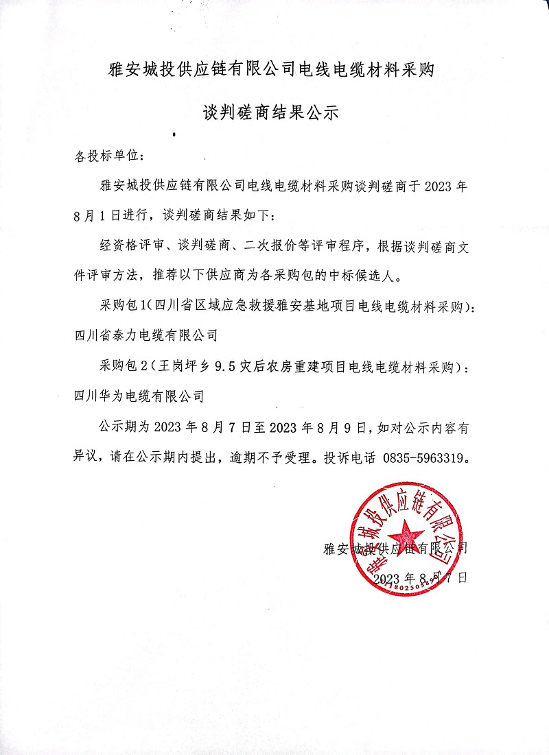 雅安城投供應(yīng)鏈有限公司電線電纜材料采購談判磋商結(jié)果公示