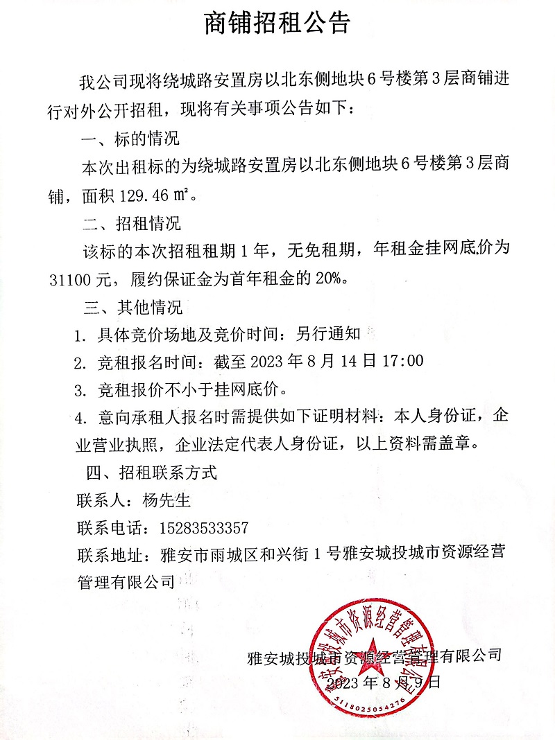 繞城路安置房以北東側(cè)地塊6號樓第3層商鋪招租公告