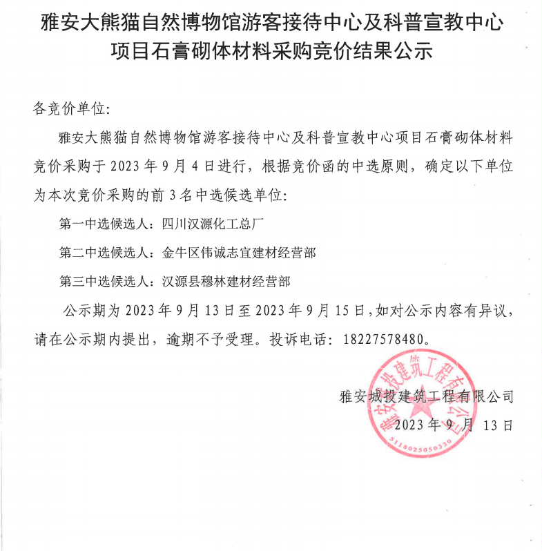 雅安大熊貓自然博物館游客接待中心及科普宣教中心項目石膏砌體材料采購競價結(jié)果公示