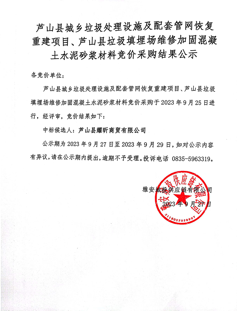 蘆山縣城鄉(xiāng)垃圾處理設(shè)施及配套管網(wǎng)恢復重建項目、蘆山縣垃圾填埋場維修加固混凝土水泥砂漿材料競價采購結(jié)果公示