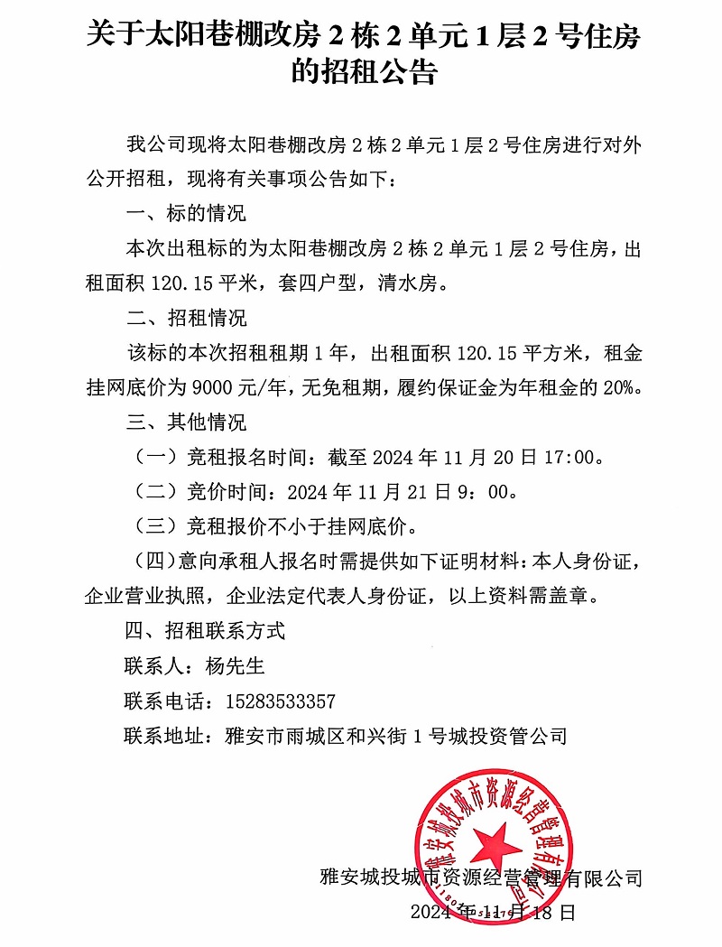關(guān)于太陽巷棚改房2棟2單元1層2號(hào)住房的招租公告