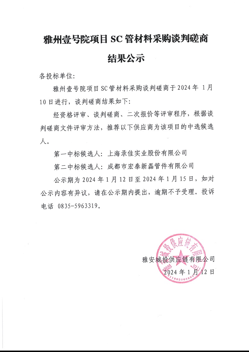 雅州壹號(hào)院項(xiàng)目SC管材料采購(gòu)談判磋商結(jié)果公示