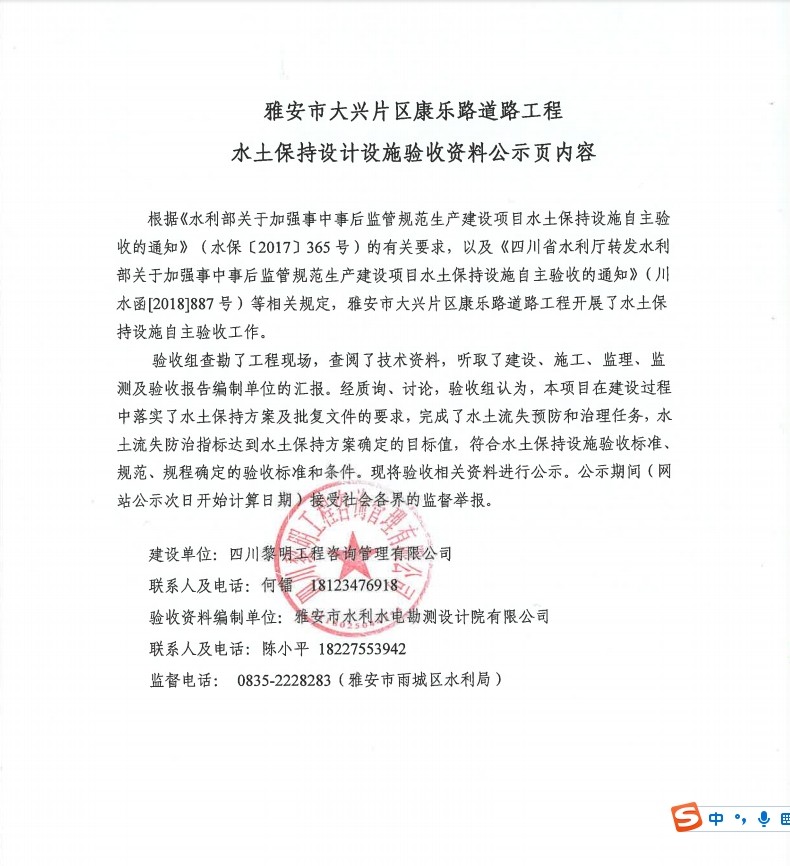 雅安市大興片區(qū)康樂路道路工程水土保持設計設施驗收資料公示頁內(nèi)容