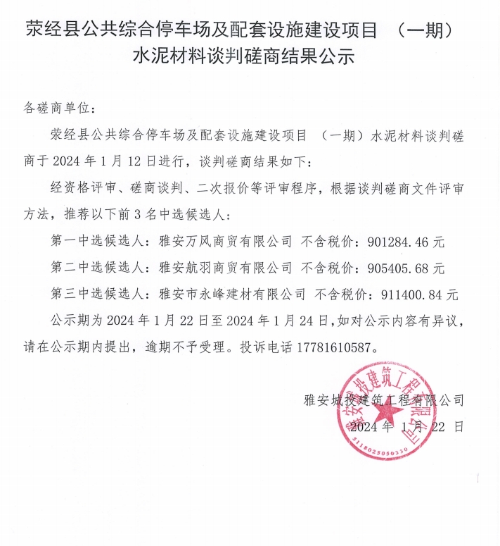 滎經(jīng)縣公共綜合停車場及配套基礎設施建設項目(一期)水泥材料談判磋商結果公示