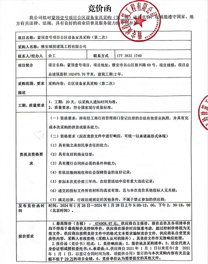 蒙頂壹號(hào)項(xiàng)目公區(qū)設(shè)備家具采購(第二次)競(jìng)價(jià)公告