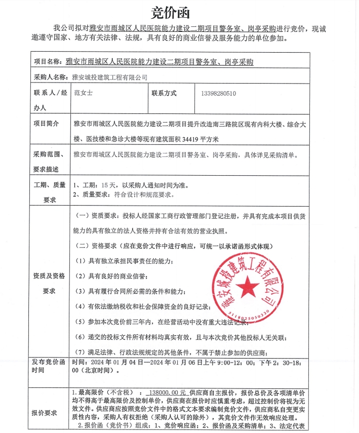 雅安市雨城區(qū)人民醫(yī)院能力建設(shè)二期項(xiàng)目警務(wù)室、崗?fù)げ少徃?jìng)價(jià)公告
