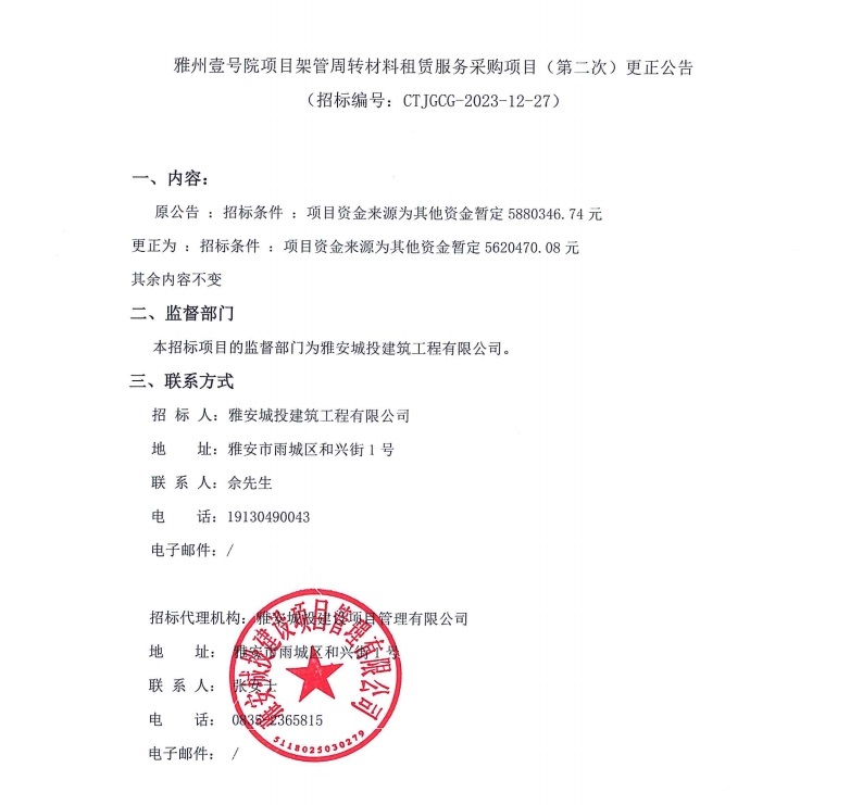 雅州壹號院項(xiàng)目架管周轉(zhuǎn)材料租賃服務(wù)采購項(xiàng)目(第二次)更正公告